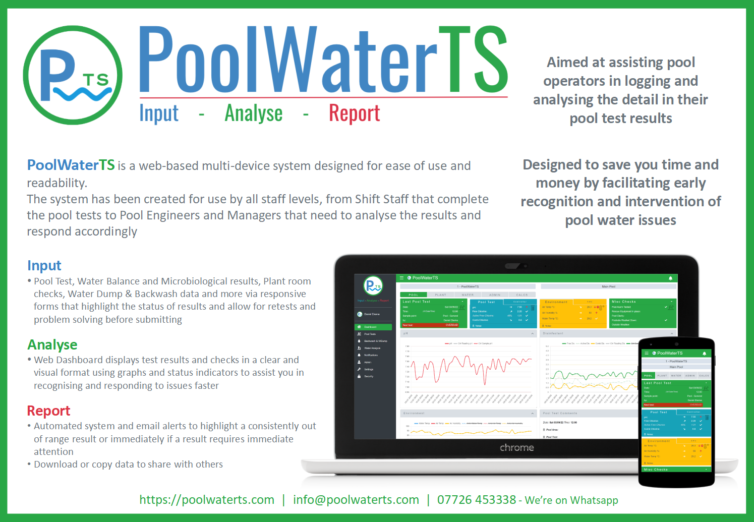 PoolWaterTS will help to inform staff at all levels about the status of pool water results and checks with validations based on PWTAG standards or site specific thresholds!